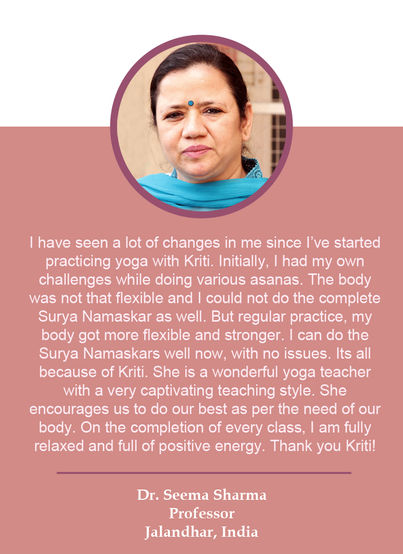 A young, effervescent, and ever-smiling girl, Kriti Gupta is all set to help you and your family with her expertise on yoga and a healthy lifestyle. A Cranio-Sacral Therapy practitioner and a yoga teacher with over 2500 hours of teaching experience, she has been focused on making a difference in the lives of people. She has so far touched and elevated the lives of over 10000 people in the last 7 years.
